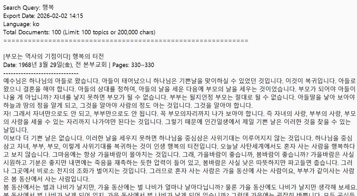 위의 방법대로 키워드 '행복'을 검색하여 나온 100개의 텍스트 파일을 AI에게 학습시킨 뒤, 교재 작성을 명령했을 때 나온 실제 결과물입니다. 사람의 손을 거치지 않고 오직 AI가 말씀 원문을 근거로 정리한 내용입니다.