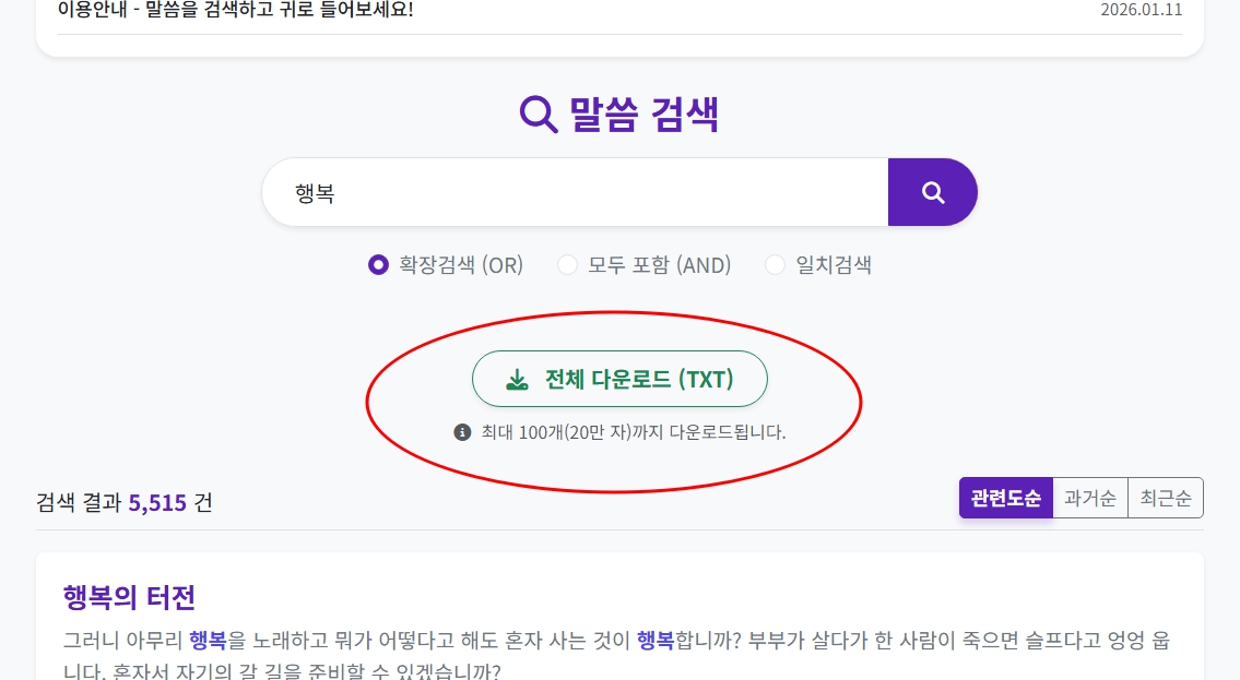 2. 데이터 확보 검색 결과로 나온 수백 개의 말씀 자료를 하나로 모으는 것이 핵심입니다. 사이트에서 제공하는 [결과 TXT 다운로드] 기능을 클릭하세요.